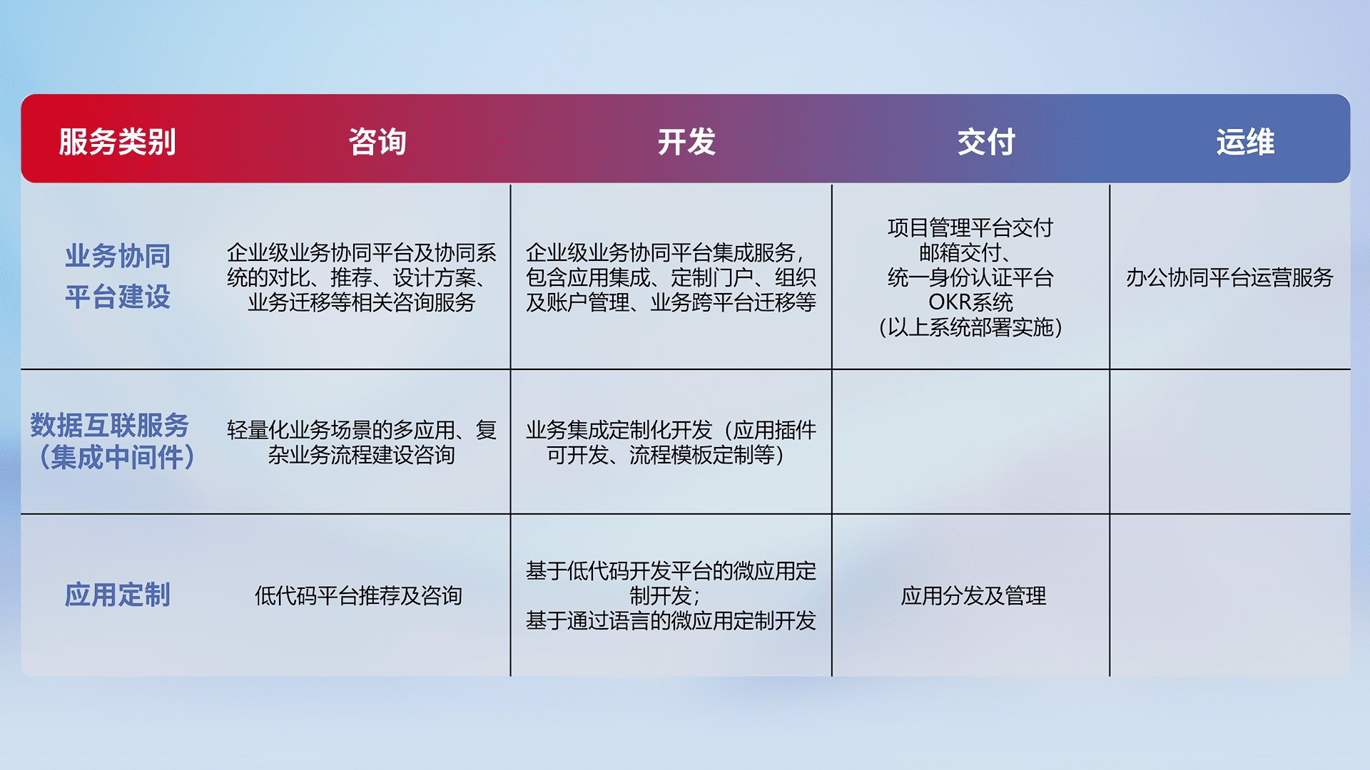 针对钉钉、、、、企微、、、、IDaas等平台级产品提供产品的规划、、方案、、交付、、、、定制化开发等服务,,实现如统一协同办公、、智能客户服务、、、、混合会议管理、、、、智能数据查询、、、、等业务场景,,,实现数字化转型。。